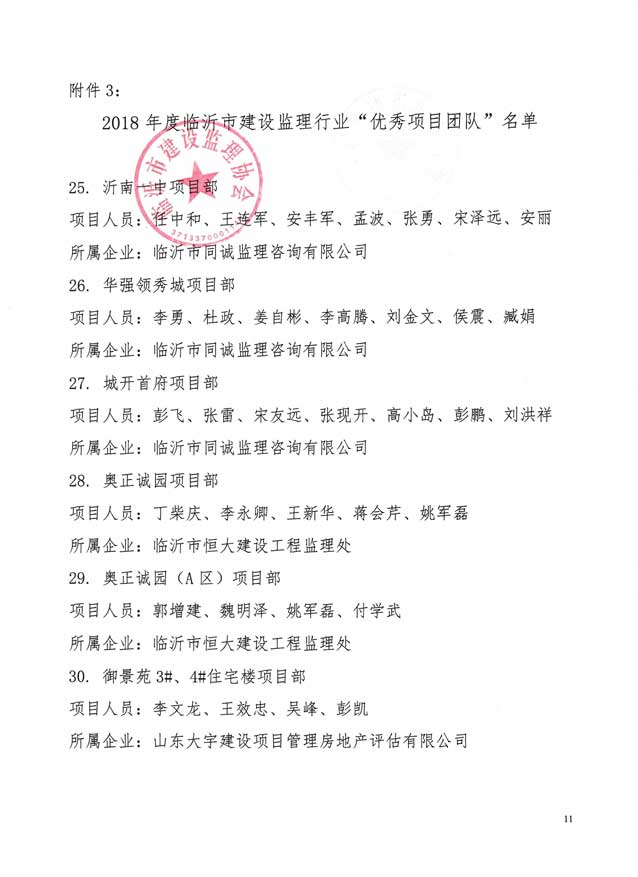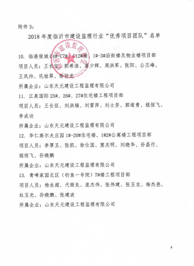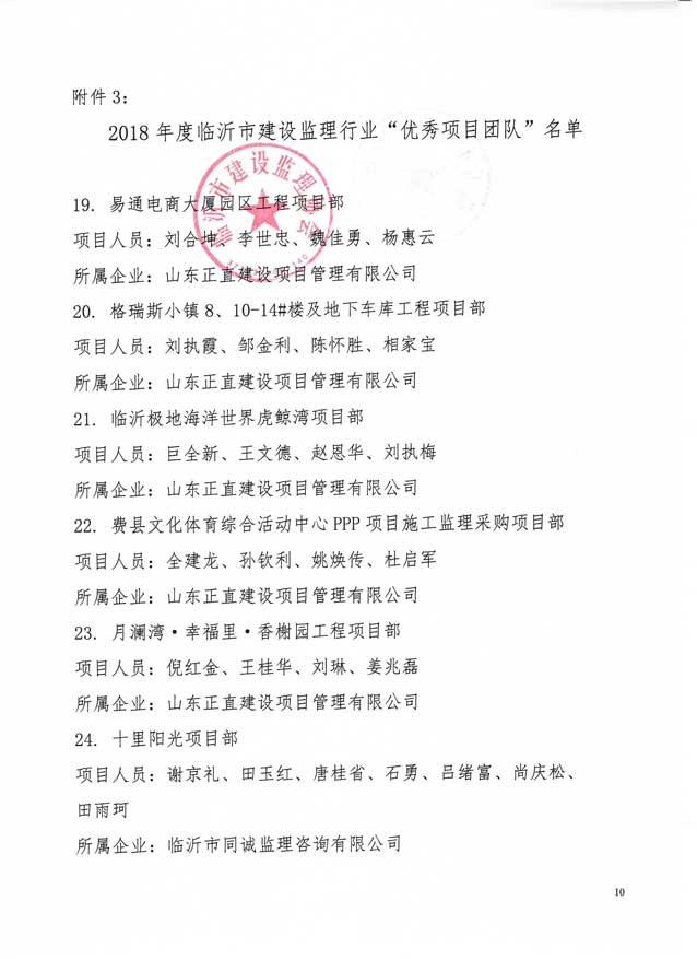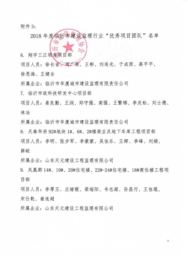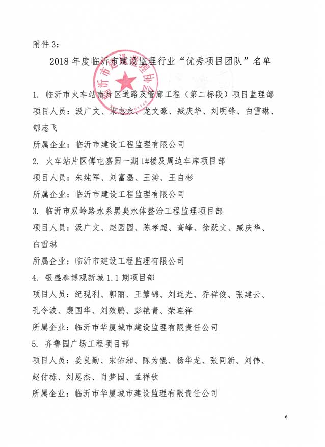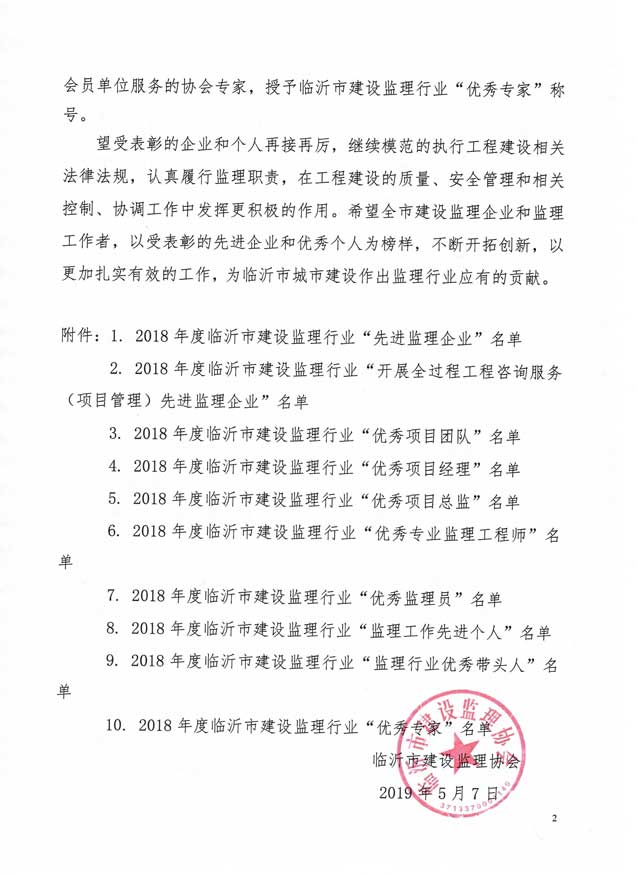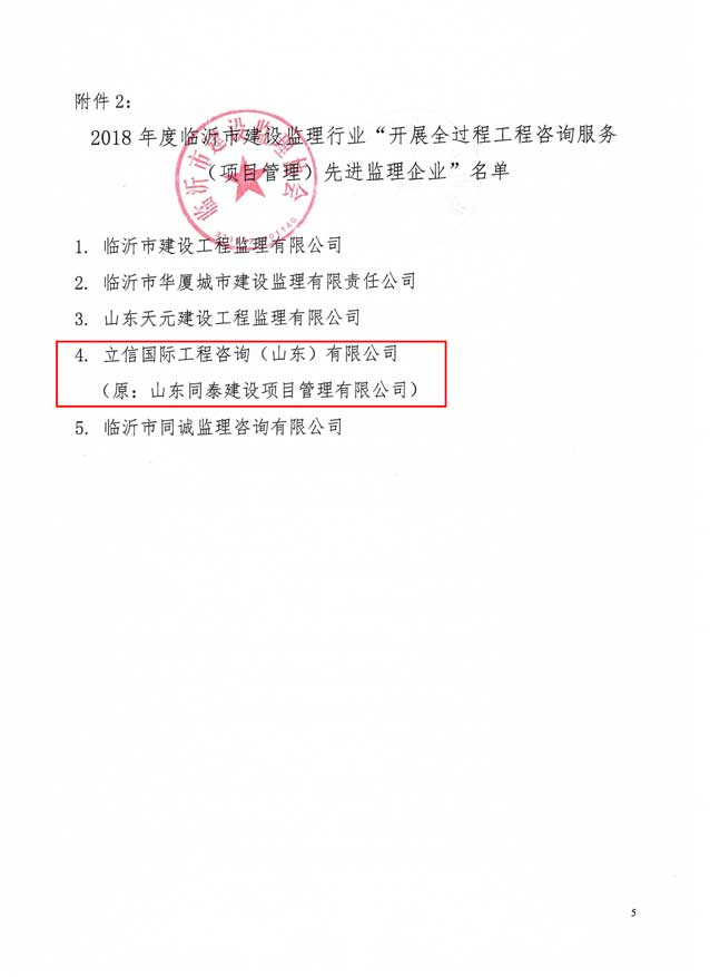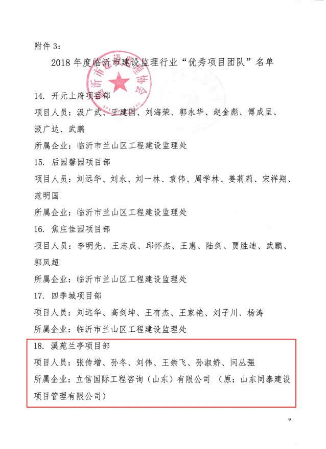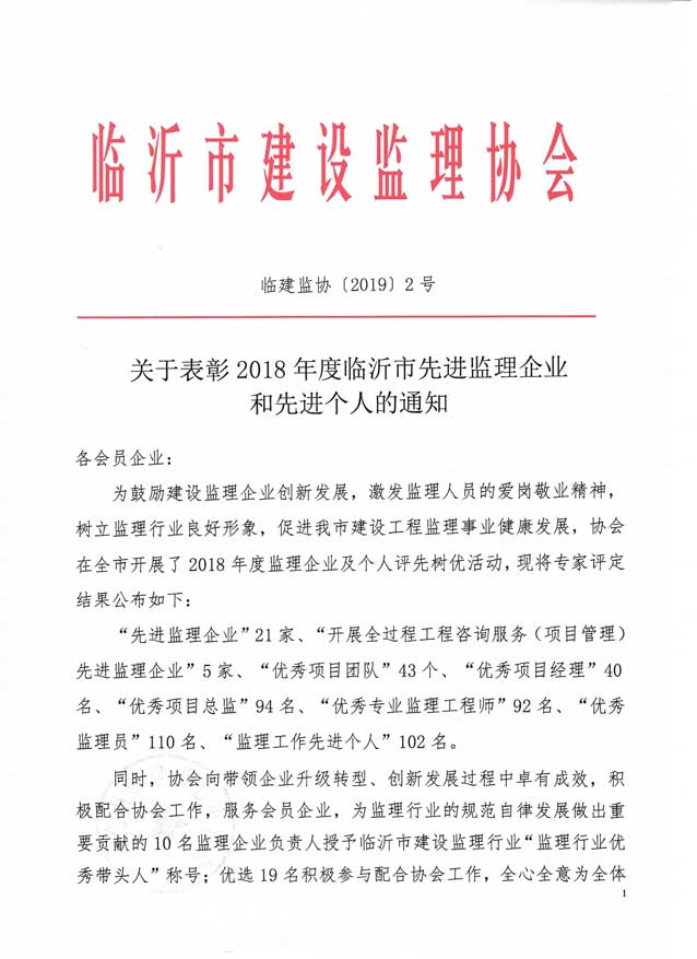 2019年5月,臨沂市建設監理協會發文表彰2018年度臨沂先進監理企業和先進個人。立信國際工程咨詢(山東)有限公司榮獲“先進監理企業”、“開展全過程工程咨詢服務(項目管理)先進監理企業榮譽稱號、溪苑蘭亭項目部榮獲“優秀項目團隊”榮譽稱號。