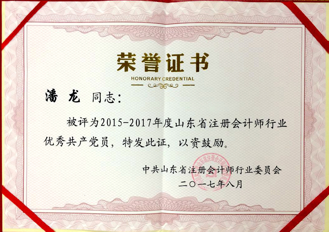近日,山東省注冊會計師行業黨委在全省行業基層黨組織中開展評選表彰活動。經過事務所基層黨組織民主評選、各市行業黨組織審核推薦和省行業黨委審定,我所獲得“先進會計師事務所黨組織”榮譽稱號,我所潘龍同志獲得“優秀共產黨員”榮譽稱號。